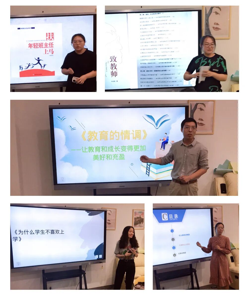 徐陈辰老师分享的《为什么学生不喜欢上学》提出的“大脑不是用来思考的,它的真正作用在于使你避免思考”观点令人惊喜又意外。张颖老师跟随《逛动物园是件正经事》一起走进动物、了解动物、倾听自然的心声。王卓然老师分享了自己恩师推荐的《扶年轻班主任上马》,指引着自己的班主任道路走得更稳更远。沈涵老师从朱永新教授的《致教师》中体会新教育的意义,认识到青年教师们更应该“扎入泥土”,做科研型的老师。王俊贤老师从《教育的情调》中感悟“我们教师应该让教育和成长变得更加美好和充盈”,并很用心的分享了读书心得,我们教师应该树立以“爱”为核心的人文主义教育。